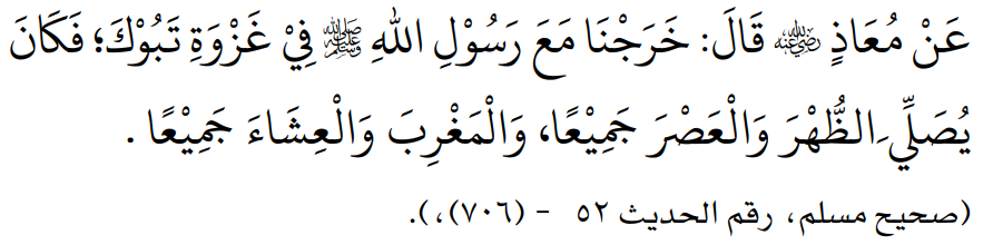 Rasulullah pada perang Tabuk. Rasulullah Shalallahu Alaihi Wassalam shalat zhuhur dan ashar dengn cara jamak, dan juga shalat maghrib dan isya dengan cara jamak “. [Shahih Muslim]